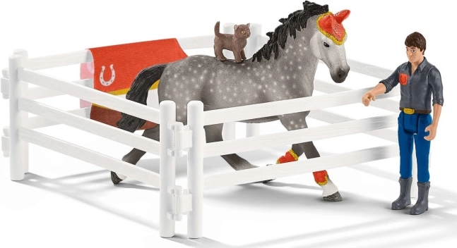 A szett része a karám elemekből összeállítható edzőkör, edző vezetőszárral és pálcával a nyugodt lóvezetéshez, felszerelés-tartó pad és egy nagy arany trófea a bajnokoknak. A játék fejleszti a finommotorikát, a képzelőerőt és a állatok iránti kapcsolatot.