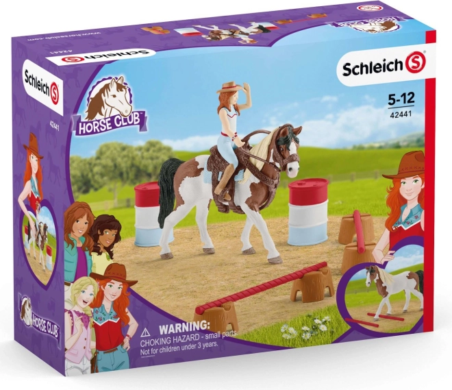 Hannah western lovaglókészlete a barrel racing versenyek hangulatát hozza el a gyerekszobába. A szett színes hordókat és alacsony akadályokat kínál, amelyeket tetszés szerint el lehet helyezni, így a gyermek könnyen megalkothatja a saját pályáját. A levehető nyeregnek és kantárnak köszönhetően Hannah felkészítheti a lovat edzésre és versenyre.