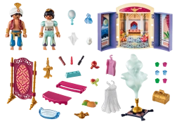 1x keleti herceg figura, 1x hercegnő figura, varázslámpa, láda és további kiegészítők, zárható játékszett doboz