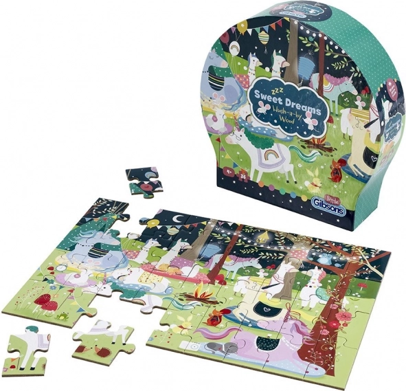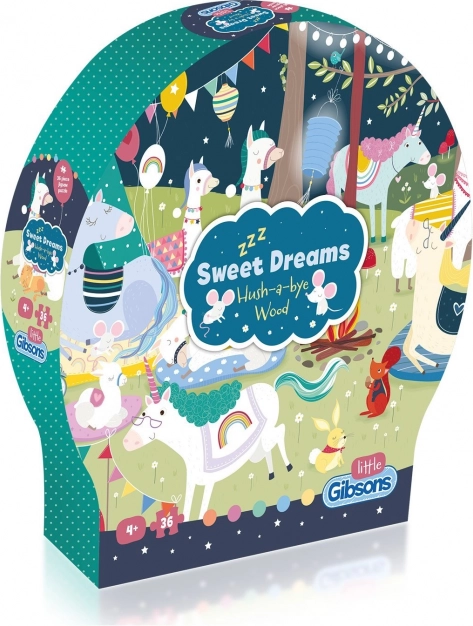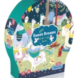 Puzzle Édes álmok 36 darabból varázslatos utazást kínál az álmok világába, tele lámákkal és unikornisokkal. Ideális a memória fejlesztésére és a gyermekek képzelőerejének mozdítására.