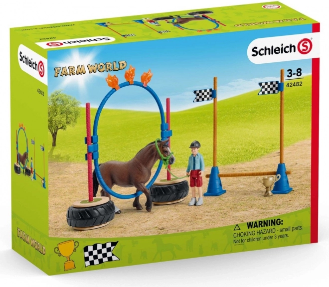 Készítsd fel walesi pónidat a agility versenyre, és nézd meg, sikerül-e biztonsággal legyőznie az akadályokat. Ez a készlet mindent tartalmaz, ami a valósághű edzési élményhez szükséges, beleértve egy fiú figurát, lovas sisakot és start-cél zászlós akadályokat. A részletek a Schleich jellegzetességei, és közelebb hozzák a vidéki életet.