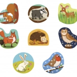 A puzzle különböző erdei állatok, mint például borzok, őzek, rókák és sok másik alakját ábrázolja.