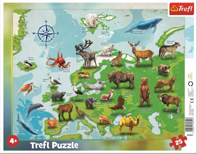 Élvezze a szórakozást a TREFL társasjáték puzzle-jával, amely Európa térképét mutatja be állatokkal. A darabok szabálytalan alakja új lehetőségeket kínál a 4 éves kortól való gyermekek számára.
