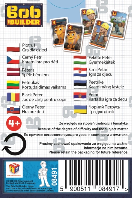 A Bob, a mester képekkel ellátott Fekete Péter gyermekjáték ideális szórakozás minden kis építő számára. A játék 25 kártyát tartalmaz, amelyeket a játékosok egymás között osztanak el. A cél, hogy párokat alkossanak és megszabaduljanak az összes kártyától a kezükben. Az nyer, akinek nincs Fekete Pétere.