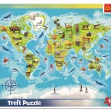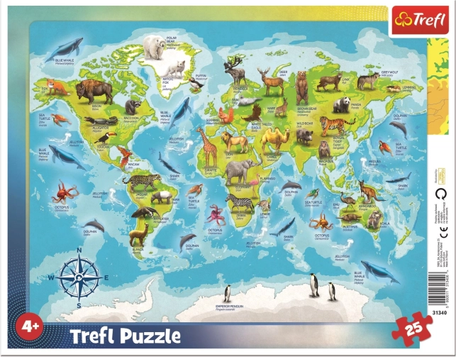 Induljon el egy kalandos útra a TREFL társaság ezen lebilincselő puzzléjával. A kép különböző kontinenseket és állatokat tartalmaz, melyek az egyes területeken élnek, és a puzzle-ön az állatok nevei angolul és lengyelül vannak feltüntetve. A puzzle kifejezetten 4 éves kortól gyermekek számára lett tervezve, hogy elősegítse kreativitásuk és finommotorikus képességeik fejlődését.