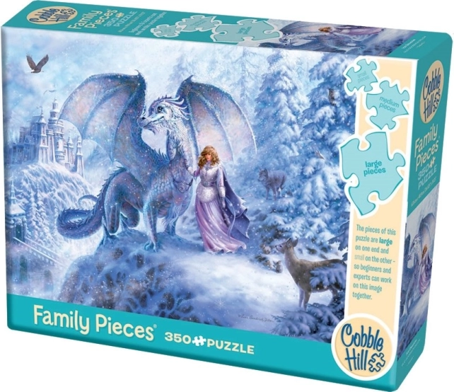 Élvezze a közös pillanatokat a COBBLE HILL Jeges sárkány családi puzzle-lel, 350 darabbal. A csomag három különböző méretű elemet tartalmaz gyerekeknek és felnőtteknek, így az egész család együtt élvezheti az építést. Az eredeti, szabálytalan formáknak köszönhetően a kirakás szórakoztatóan kihívást jelent, a kész kép pedig gyönyörű részletekkel tűnik ki. Családi formátum háromféle elem-mérettel, eredeti stancolás klasszikus rácsozat nélkül, jeges sárkány motívum és a COBBLE HILL minőségi kivitele garantálják a remek élményt.
