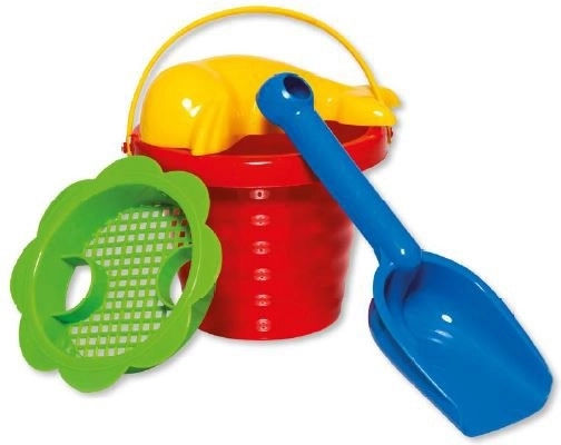 A szett tartalmaz egy 11 cm magas vödröt, lapátot, formát és szitát – alapfelszerelés várépítéshez, formázáshoz és a homok szállításához. A színek változhatnak, így minden készlet egyedi darab.