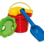 Vödör, lapát, forma és szita – ideális kombináció homokvárak építéséhez és vízparti játékhoz.