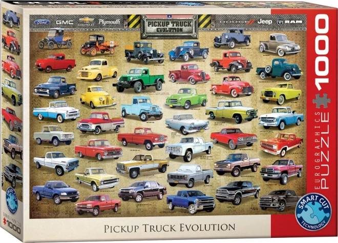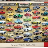 Fedezze fel a stílusos puzzle-t a pickupok fejlődésének motívumával a EUROGRAPHICS márkától, 1000 darabbal. A speciális, nem hagyományos kivágás a szokatlan alakú darabokkal növeli a nehézségi szintet, és hosszabb, szórakoztatóbb kirakást biztosít. A képen lévő feliratok angol nyelvűek. Összerakott méret kb. 67,63 × 48,89 cm.