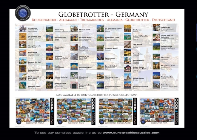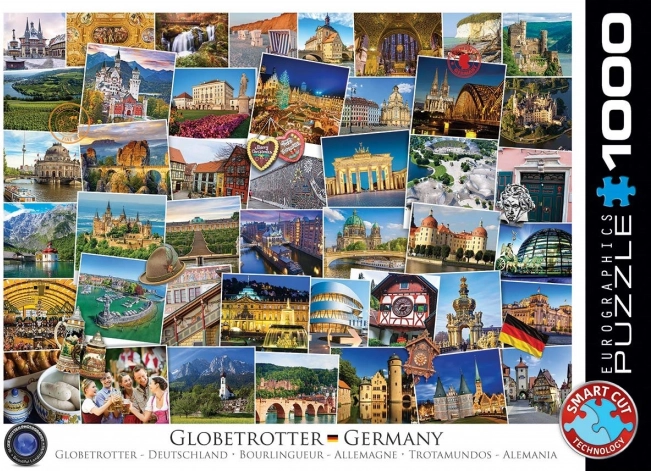 Fedezze fel Németország szépségeit a 1000 darabos, kiváló minőségű EUROGRAPHICS kirakóval. Az egyedi, szabálytalan formájú stancolásnak köszönhetően az összeállítás egyszerre kihívás és szórakozás. Az elkészült méret kb. 68 × 48 cm. Eredeti kirakódarab-formák, magasabb nehézségi szint és részletes Németország-térkép minden puzzle- és utazásrajongónak örömet okoz.