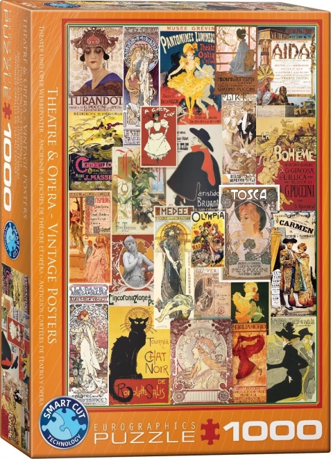 Élvezze a művészi kihívást a EUROGRAPHICS 1000 darabos kirakójával, amely vintage opera- és színházi plakátokat ábrázol. A nem szabványos rácsozású és szokatlan alakú elemeket használó stancolás növeli a nehézségi szintet, és szórakoztató, nem monoton kirakást biztosít. Összeállítva kb. 48 × 68 cm méretű kép készül.