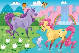 Aranyos CLEMENTONI gyermekkirakó-készlet két kirakóval, unikornis motívummal, összesen 2×20 darabbal a vidám kirakáshoz. A fényes, gyémánthatású bevonatnak köszönhetően minden kép ragyog, a SuperColor élénk színei pedig hosszan szépek maradnak. A kirakók fejlesztik a kézügyességet és a megfigyelőképességet, és 3 éves kortól ajánlottak. Az összeállított kirakó mérete kb. 27 × 19 cm.