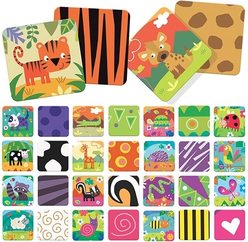 A szett 50 kártyát (25 pár) tartalmaz, az állatok logikus, élőhely szerinti csoportosításával: rét, őserdő, szavanna, erdő és tanya. A kemény és tartós kártyáknak, valamint az élénk színeknek és formáknak köszönhetően a játék vonzó és hosszú távon is használható. Többféle játékváltozatot kínál, és kiválóan alkalmas 3–6 éves óvodásoknak.