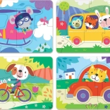 A készlet négy önálló puzzle-t tartalmaz 24 x 16 cm-es méretben, eltérő darabszámmal (5-től 8-ig), amelyek lépésről lépésre fejlesztik a gyermek kirakókészségét és növelik a nehézséget. Minden puzzle lehetővé teszi egy-egy közlekedési eszköz külön kivételét és kirakását, ami támogatja a gyermekek finommotorikájának és logikus gondolkodásának fejlődését.