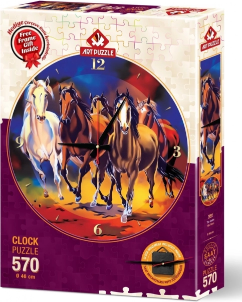 Összeállítása egyszerű: a puzzle-t a mellékelt alapra ragasztás után összeállítja a keretet, behelyezi a motívumot, rögzíti a klipeket és felszereli az óraszerkezetet. Az eredmény egy dekoratív óra kb. 46 cm átmérővel, amely a lovak és a puzzle kihívások kedvelőinek is örömet szerez.