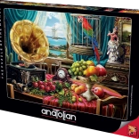 Ez a gyümölcsökkel és gramofonnal díszített csendélet puzzle nagyszerű módot kínál a szabadidő eltöltésére, és egyben a kirakós készségek fejlesztésére. Ideális választás azoknak, akik szeretik a puzzle-okat és a művészetet, és gyönyörű képet szeretnének létrehozni.