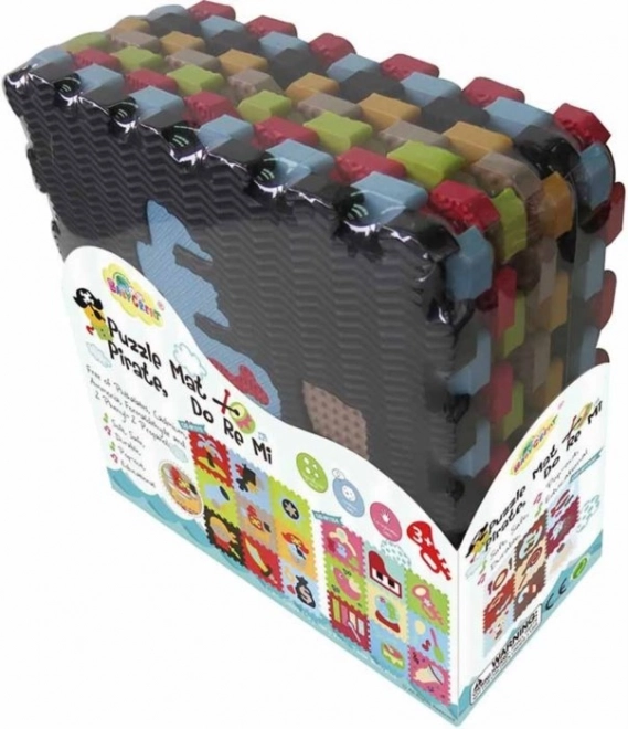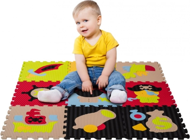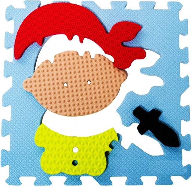 A kalóz témájú habszivacs kirakó biztonságos játszótérré varázsol bármelyik szobát. Kilenc, egymással összekapcsolható elem kivehető formákkal és különböző felületi textúrákkal, amelyek színeikkel és tapintásukkal is lekötik a gyerekeket. Az anyag kellemesen puha, könnyen tisztítható, és csillapítja az ütéseket és a zajt.