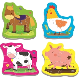 A farm állatai témájú puzzle-k szórakoztató és oktató tevékenységet kínálnak gyermekeinek. Ez a készlet 18 darabot tartalmaz, amelyekből 4 különböző állatkép rakható össze: ló, tehén, csirke és malac. Segítségükkel a gyerekek megtanulják felismerni az állatokat és gyakorolják a számolást.