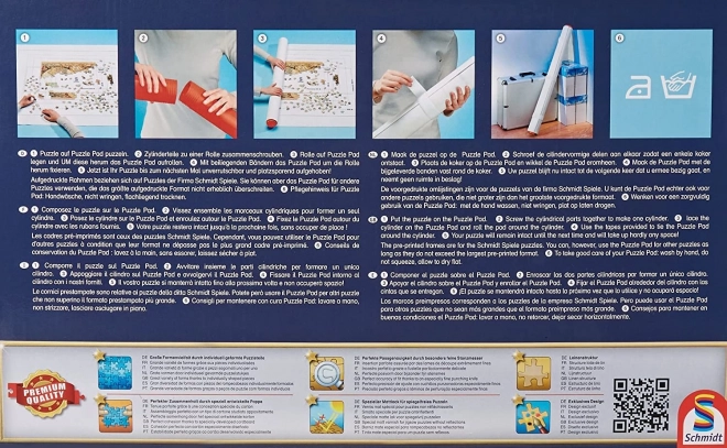 Vannak gyerekei? Vagy háziállatai? Esetleg kevés a hely? A praktikus alátétet az épp kirakott képpel együtt egyszerűen feltekerheti, így ideális a helytakarékossághoz és a kirakó megőrzéséhez. Az alátét legfeljebb 137 x 100 cm méretű puzzle-höz alkalmas (a legtöbb gyártó 3000 darabos kirakóinak felel meg). A puzzle-szőnyeg ideális a hely megtakarítására és a félig kész vagy kész kép biztonságos tárolására. Az alátét biztosítja a kirakó biztonságos tárolását vagy szállítását. A puzzle-t közvetlenül a szőnyegen rakja ki, és amikor eljön a pakolás ideje, a műanyag tubus két részét összecsavarja, majd a szőnyeget a kirakóval együtt rátekeri. Ezután a mellékelt pántokkal szorosan rögzíti, és biztonságosan elhelyezheti például az ágy alá vagy a szekrény tetejére. A SCHMIDT márkájú puzzle alátét előnye, hogy a SCHMIDT puzzle-k (500–3000 darab) körvonalai előre fel vannak rajta nyomtatva, így már a keret kirakásakor pontosan elhelyezheti a kirakót. Megjegyzés: A SCHMIDT feltekerhető alátéten természetesen más márkák puzzle-jei is kirakhatók, amennyiben a méretük nem haladja meg az alátét méretét, ugyanakkor számolni kell az ésszerű ráhagyással. A csomag tartalma: 137 x 100 cm-es alátét, műanyag henger és 3 pánt. A képen látható puzzle nem része a csomagnak. FIGYELMEZTETÉS: Ha más márkájú puzzle-höz vásárol szőnyeget, javasoljuk a készre rakott puzzle méreteinek ellenőrzését. Filc alátét kezelése: Az alátét alacsony hőfokon vasalható, lehetőleg vékony szövetrétegen (konyharuha) keresztül. Kézzel mosható hideg vízben, nem csavarható és nem szárítható szárítógépben.