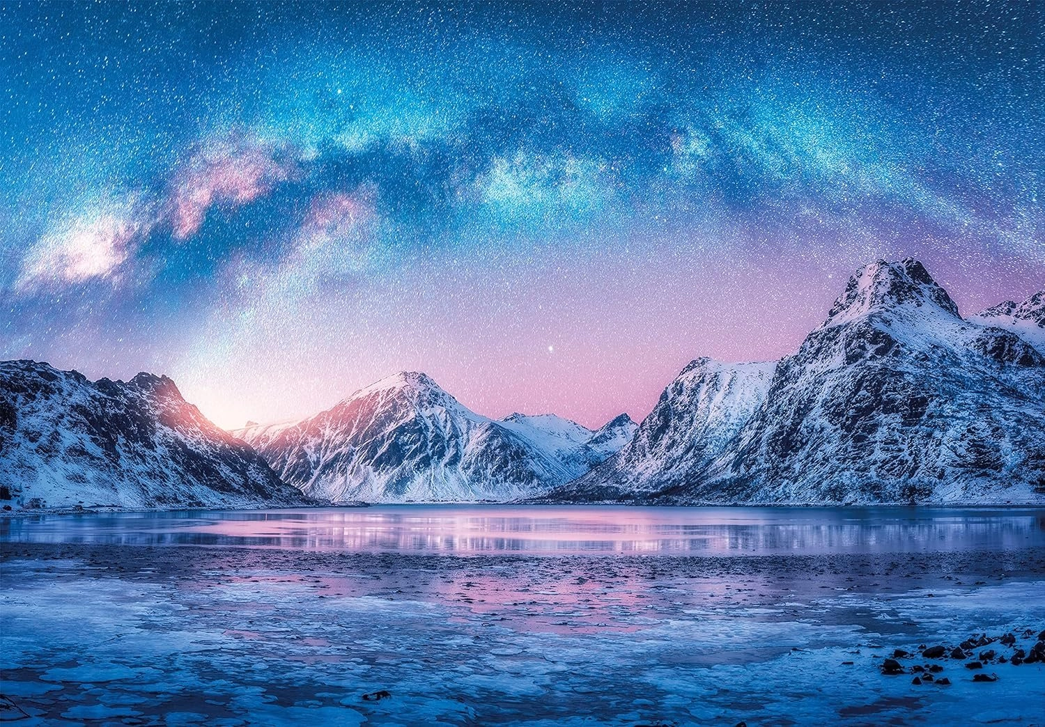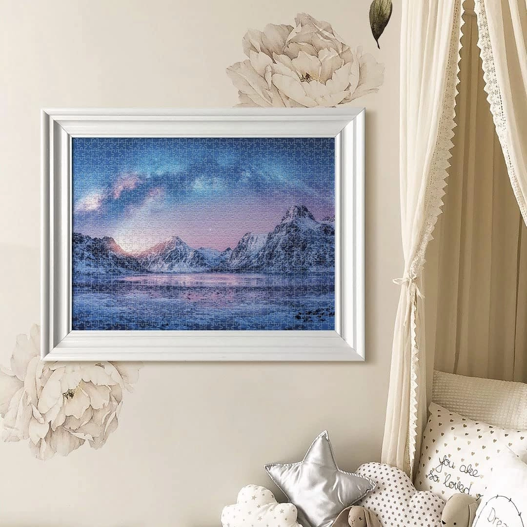 Hegyekkel, tóval és csillagos égbolttal ábrázolt táj, amely segíti a fókuszt és a belső békét kirakás közben.