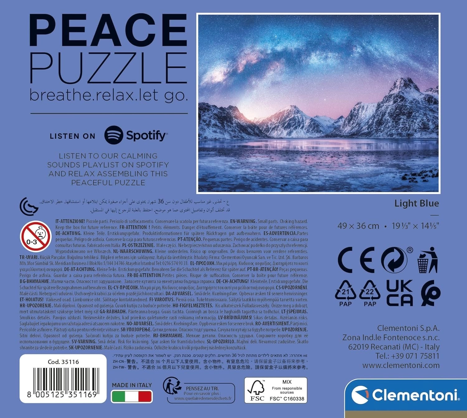 Élvezze a nyugalom perceit a CLEMENTONI Peace Collection Light Blue kirakóval. A prémium darabok minőségi, vastag kartonból tökéletesen illeszkednek, a csillogó égbolttal díszített, nyugodt északi táj motívuma pedig ideális hangulatot teremt a meditatív kirakáshoz.