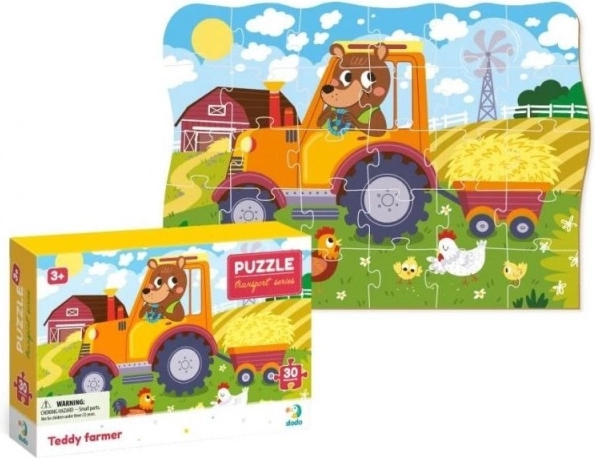 Szórakoztató gyerek puzzle, DODO Közlekedés: Gazda Teddy, amely 30 darabbal, gyönyörű illusztrációkkal és kontúros peremmel segíti a könnyebb kirakást. A kész kép mérete 27 × 20 cm, 3 éves kortól ajánlott, és összekapcsolható a sorozat további jeleneteivel.