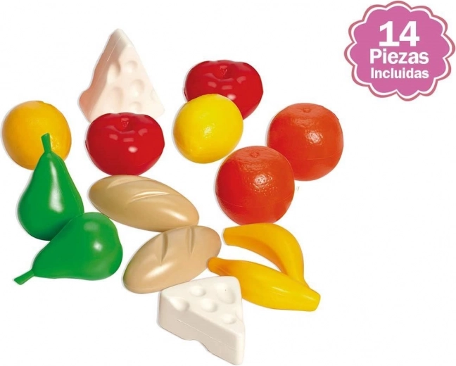 A csomag műanyag élelmiszereket tartalmaz, többek között gyümölcsöket (körték, almák, banánok) és további darabokat a változatos játékhoz.
