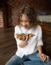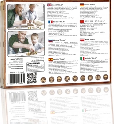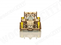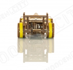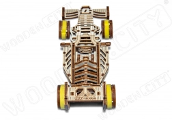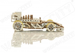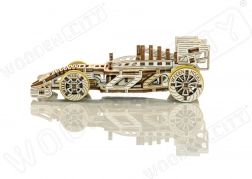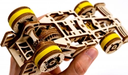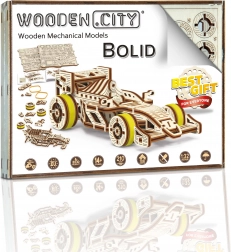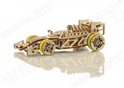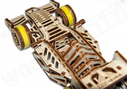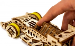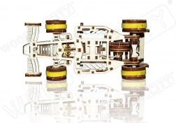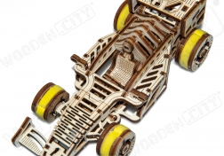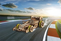 A WOODEN CITY fa 3D puzzle Versenyautó lenyűgöző kiegészítő minden mechanika és versenyautó rajongó számára. Kiemelkedik forgatható első kerekekkel, lendkerekes mechanizmussal és visszahúzható kerékkel. A modell gumi motorral van felszerelve, amely akár 45 cm-es hajtást biztosít egy húzással.
