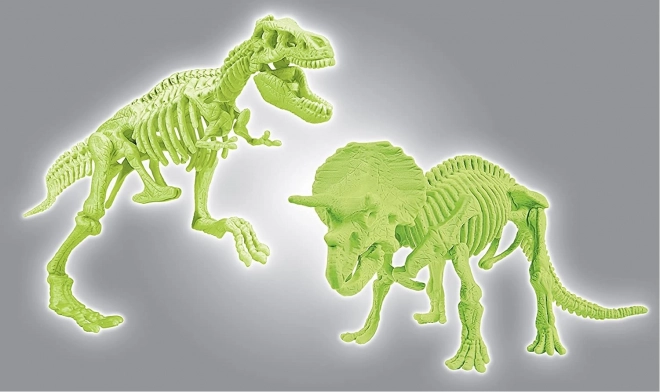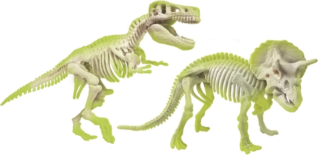 A fluoreszkáló csontdarabok elnyelik a nappali fényt, és sötétben ragyognak. A kész T‑Rex és Triceratops modellek látványos dekorációk és egyben oktatási segédeszközök.