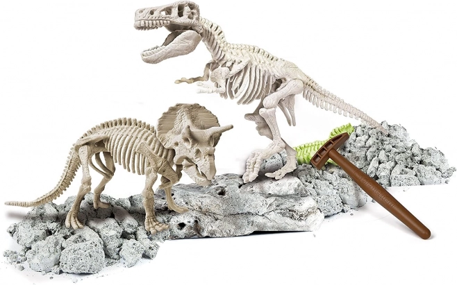Ez az oktató készlet a Science & Play sorozatból hiteles élményt nyújt a paleontológiai kutatásból. A „kőzet” blokkban két részletgazdag csontváz elemeit találod, amelyeket kalapáccsal és vésővel óvatosan felszabadítasz, majd impozáns modellekké állítasz össze. A speciális fluoreszkáló anyag elnyeli a nappali fényt, és sötétben világít, ami fokozza a wow‑hatást és motivál a további felfedezésre.