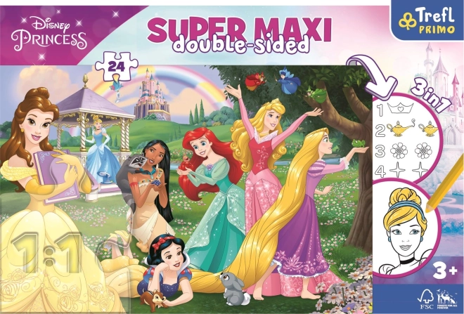 A Super Maxi kétoldalas puzzle dupla adag szórakozást nyújt a gyerekeknek. Az egyik oldal színes DISNEY PRINCESS motívumot és 24 nagy darabot kínál, amelyeket a kis kezek könnyen össze tudnak illeszteni. A másik oldal színezőként és egyszerű számolós tevékenységként szolgál, ami támogatja a logikus gondolkodást és a kéz–szem koordinációt.