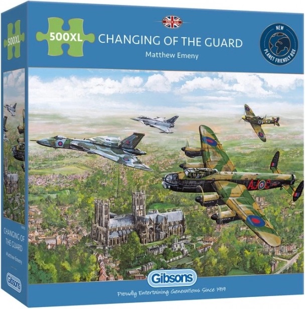 Merüljön el a brit légierő történetében ezzel az egyedülálló Őrségváltás puzzle-lel. 500 darabot tartalmaz, és megragadja azt a pillanatot, amikor a híres RAF repülőgépek az ikonikus lincolni katedrális felett repülnek.