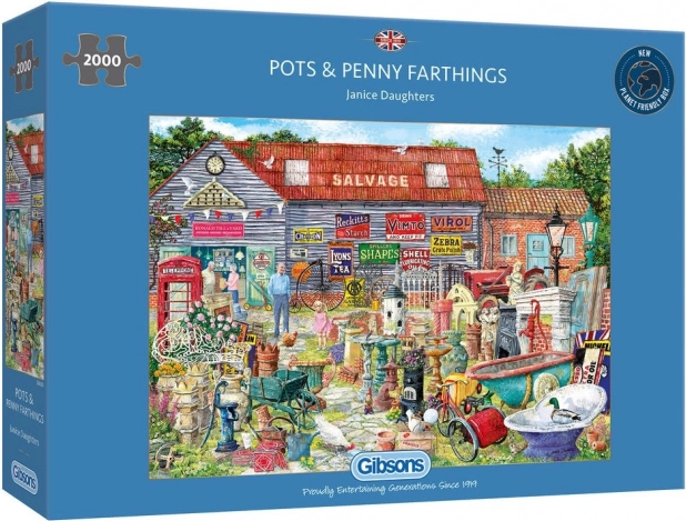 Fedezze fel a nosztalgia varázsát a Gibsons nagy méretű puzzle-jével – Fazekak és ócskaságok fillérekért 2000 darabbal. Részletgazdagon illusztrált udvari jelenet várja, tele kincsekkel – igazi csemege az antikvitások szerelmeseinek és a tapasztalt kirakók számára. A csomag tartalmaz mintaképet, a kész kirakó pedig egy minőségi, nagyformátumú kép 98 × 68 cm méretben.
