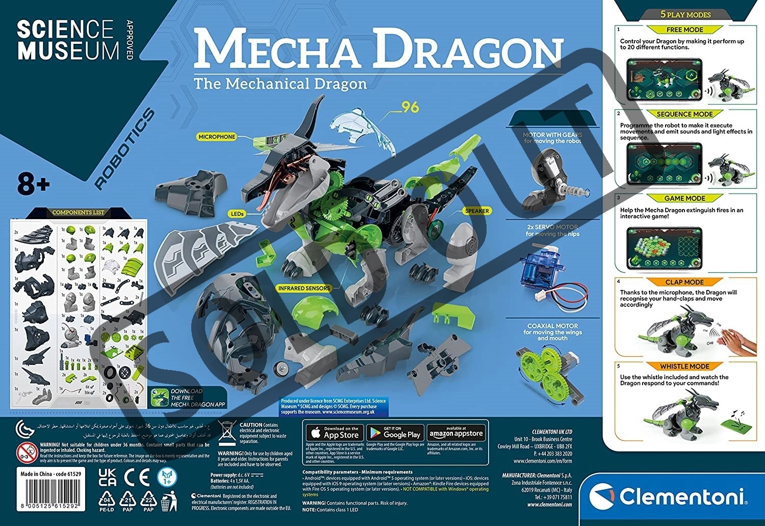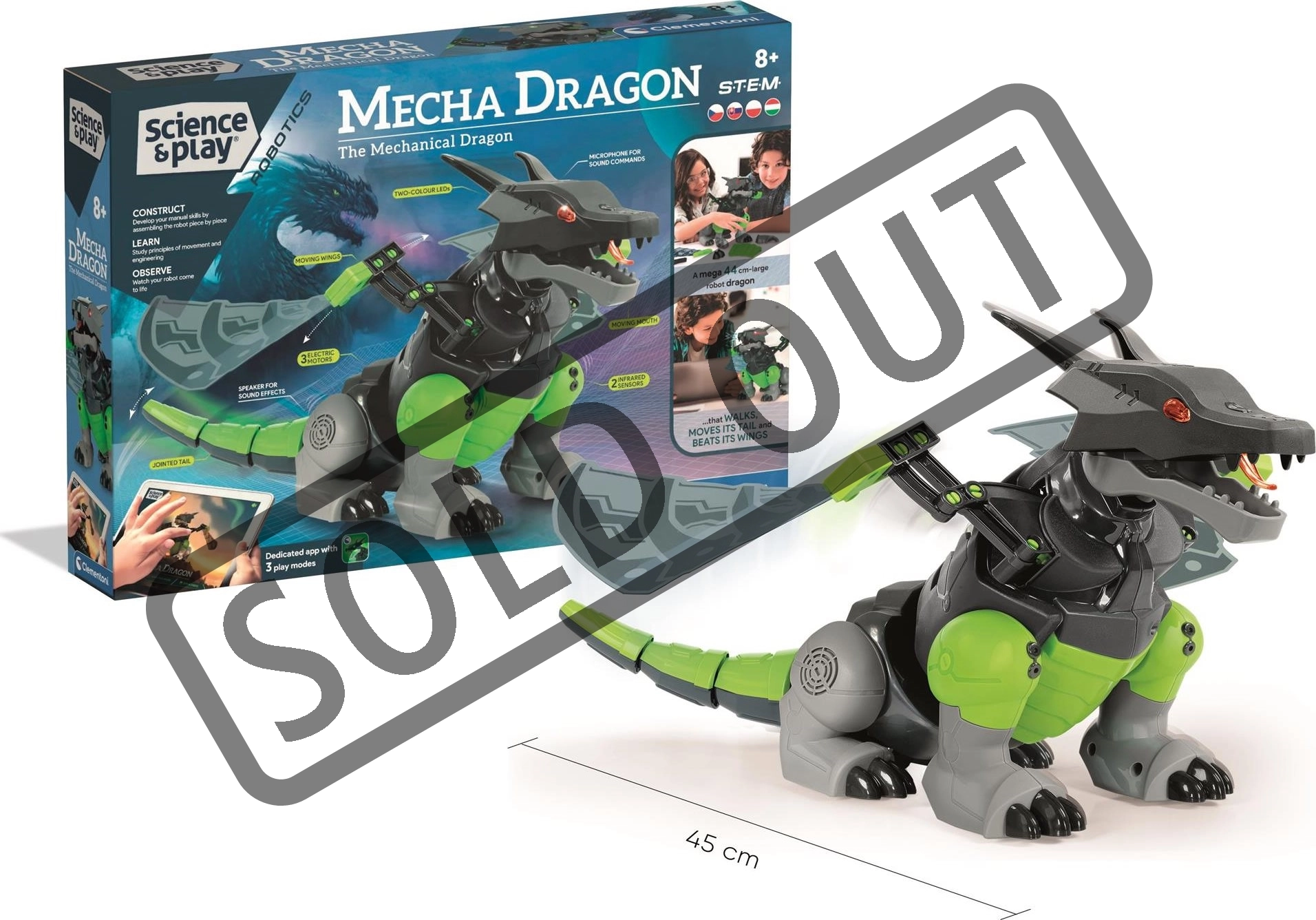 Építse meg saját robotikus sárkányát, és éljen át kalandokat a CLEMENTONI modern STEM játékával. A Mecha Dragon 44 cm hosszú, 96 elemből áll, 3 játékmódot és akár 22 funkciót kínál. Az okos érzékelőknek és a három motornak köszönhetően élethűen lépked, csapkod a szárnyaival, kinyitja a száját, forog, és „üldözi a zsákmányt”, mint egy igazi.