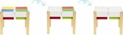A kétszínű, forgatható és kivehető asztallap két részből áll: az egyik oldal kompatibilis az építőkockákkal és kreatív építésre ösztönöz, a másik sima rajzoláshoz, íráshoz és kézműveskedéshez. Középen 4 tágas kosár található, amelyekbe a gyerekek eltehetik a kockákat, ceruzákat, papírokat és könyveket – a rendrakás pillanatok műve.