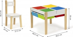 Alakítson ki a gyerekeknek saját kreatív sarkot az ECOTOYS szettel, amely egyesíti a játékkasztalt és a tárolóhelyet egyben. A masszív fenyőfa lábak és a tartós MDF lap stabilitást és hosszú élettartamot biztosítanak. Letisztult skandináv dizájnja miatt tökéletes a gyerekszobába, játszószobába vagy váróterembe.