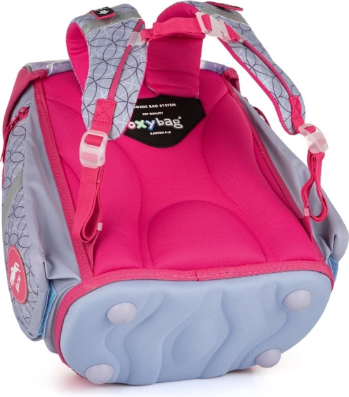 Anatómiailag formázott hát rész belső merevítéssel, légáteresztő párnázás és széles, párnázott pántok oszlatják el egyenletesen a terhelést, védve a gyermek hátát.