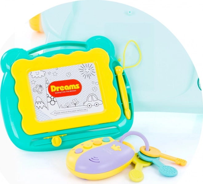 - Interaktív szórakozás: rajztábla tollal, tükör, fogaskerekek és további játékok.