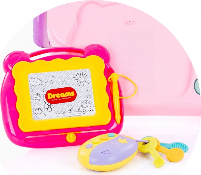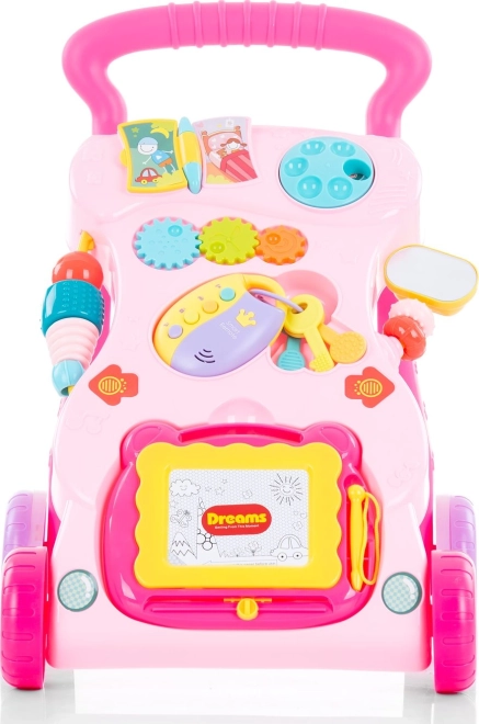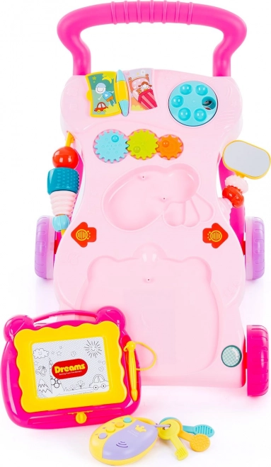 Tartozék a rajztábla tollal, tükör, színes fogaskerekek, gombok és kulcsok „okos” távirányítóval. A levehető játékok önállóan is használhatók, ami meghosszabbítja a szórakozást és támogatja a kreativitást. A járássegítő fényeket, dallamokat és hangokat játszik le, ezzel ösztönzi a hallást, a látást és a koncentrációt. Ajándékdobozban csomagolva – remek ajándékötlet.