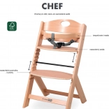A FreeOn Chef Natur praktikus és elegáns, növekvő etetőszék, amely alkalmazkodik gyermeke magasságához és igényeihez. A tömör bükkfa hosszú élettartamot és stabilitást biztosít, míg az ergonomikus formázás támogatja a helyes testtartást. A változatos beállításnak köszönhetően könnyedén használható étkezőasztalnál és íróasztalnál is.