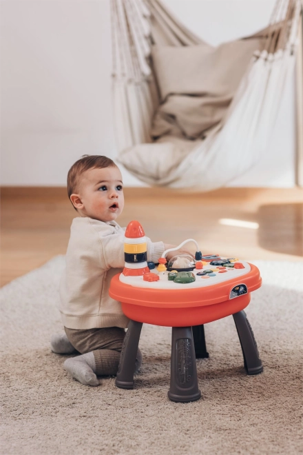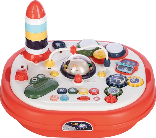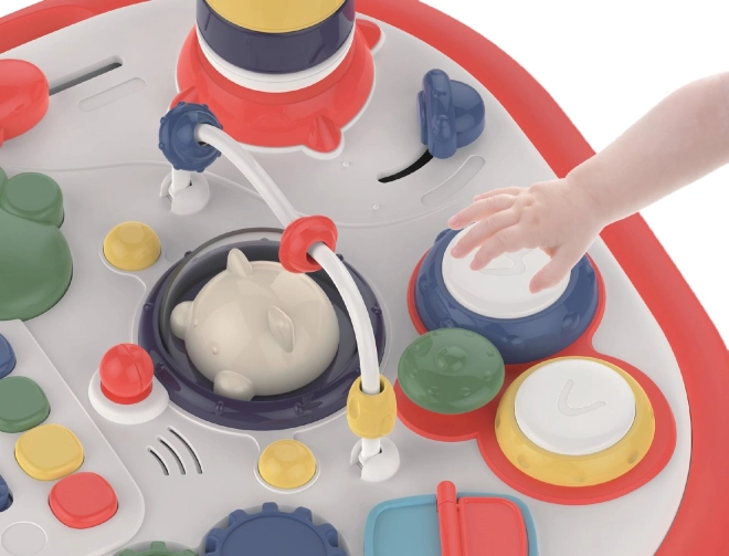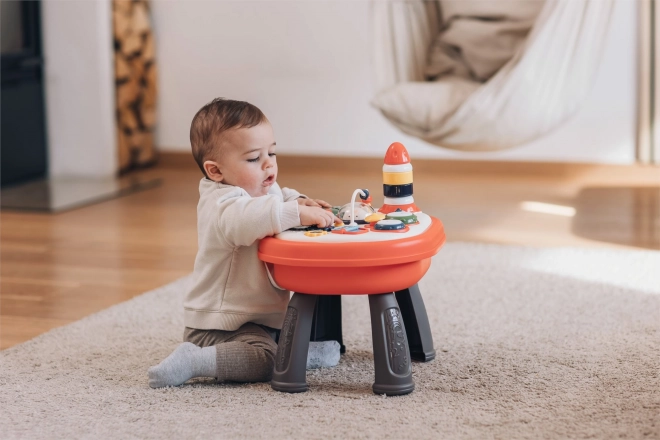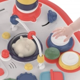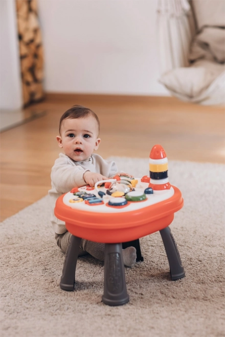 Szórakoztató interaktív asztalka a legkisebbeknek, amely fejleszti az érzékelést, a finommotorikát és a kreativitást. Fény- és hangeffekteket kínál, kétlépcsős hangerőszabályzással, forgatható panellel, amely egyik oldalán LEGO típusú építőkockákhoz kompatibilis alaplapként szolgál, valamint sok gombbal, fogaskerékkel és játékelemmel. A panel kivehető, az asztalka pedig játéktároló dobozként is használható.