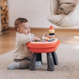Az asztalka játékos tanulást támogat – a gyerekek megtanulják megkülönböztetni a formákat, színeket és hangokat, gyakorolják a fogást és a kéz–szem koordinációt. Középen mókás funkció vár: a gomb meghúzására a kupola alatt megpördül a cica. Nem hiányoznak a fogaskerekek, a csörgő gyöngyök és az építést segítő elemek sem. Az egész asztalka könnyen használható praktikus tárolódobozként is.
