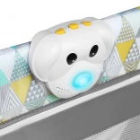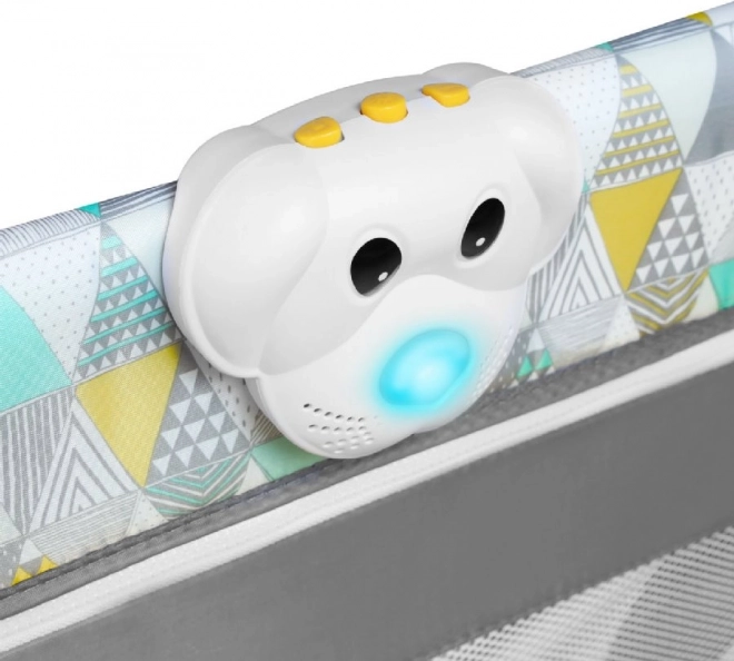 A gazdag tartozékkészlet pelenkázó feltétet, újszülött betétet (2 magassági szint), 3 zsebes oldalsó panelt és szúnyoghálót tartalmaz. A biztonsági zárral ellátott cipzáras oldalsó bejárat lehetővé teszi a nagyobb gyermekek önálló ki- és bejutását. A szórakozásról a dallamok és az interaktív kutyus gondoskodnak, míg a fékezhető kerekek megkönnyítik a mozgatást otthon és útközben is.
