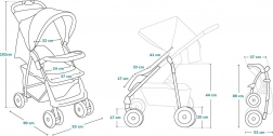 A háttámla fokozatmentes állítása egészen fekvő helyzetig és az állítható lábtartó biztosítja a gyermek helyes testtartását utazás és pihenés közben is. A kihajtható kupola véd a széltől és a naptól.