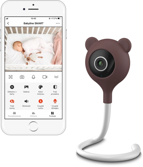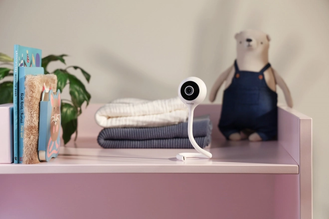 A rugalmas állvány megkönnyíti az elhelyezést bútoron vagy kiságyon, a szilikon borítás „medvefülecskékkel” pedig stílusosan illeszkedik a gyerekszobába. A nyugodt elalvást altatódalok és természet hangjai támogatják.