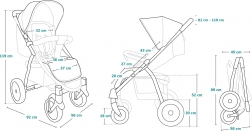 A praktikus felszereltséghez tartozik az állítható tolókar, a lecipzározható, ökobőrből készült karfa, a tágas, 9 kg teherbírású bevásárlókosár és a kupolába épített zseb. A biztonságról ötpontos övek, lábfék és fényvisszaverő elemek gondoskodnak. A csomag része a meleg lábzsák, az italtartó és az újszülött-szűkítő betét, így a babakocsi már születéstől kényelmesen használható.