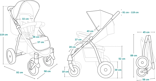 - Szülői praktikum: könnyű összecsukás, állítható tolókar, 9 kg-os kosár, italtartó, zseb a kupolában