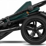 - Védelem és biztonság: UPF 50+ kupola, ötpontos öv, fényvisszaverő elemek, lábfék