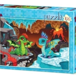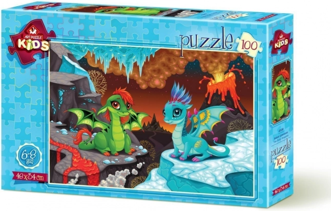 Szórakoztató gyerek kirakó aranyos sárkány motívummal, 100 darabbal, összeállítva kb. 48 × 34 cm méretben. Ideális a finommotorika, a türelmet és a logikus gondolkodás fejlesztésére.