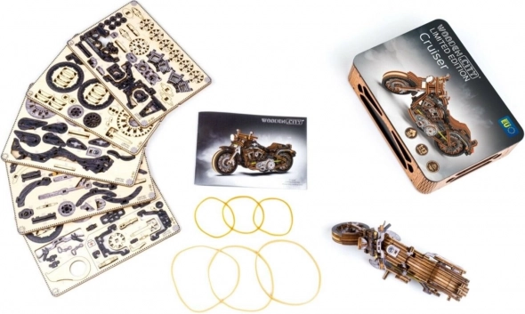A WOODEN CITY Cruiser V-Twin 3D fa puzzle autentikus élményt nyújt a mechanikus modell építésében ragasztó vagy szerszám nélkül. Ez a modell környezetbarát nyír rétegelt lemezből készült, és tartalmaz valódi motor részleteket. A modell felajánlja: